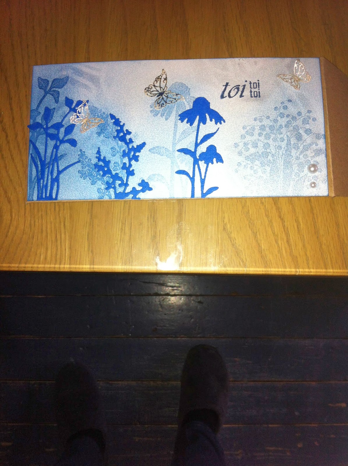 Ik heb dit kaartje gemaakt met postcard stempel van de vlinder 6410/0072 en alleen de vlinder gebruikt ingekleurd met Pan Pastels de kleuren Phthalo Blue Shade 560.3 en Permanent Red Shade 340.3 ook de achtergrond is met deze kleuren gedaan maar eerst wat goosbumbs erop , alles gefixeerd met Ghiant fix . Daar heb een stukje van de onleesbare tekst stempel op gedaan 6410/0024 en de tekst is van 6410/0022 de Swirl is 6003/0002 met wat pareltjes 6020/0022